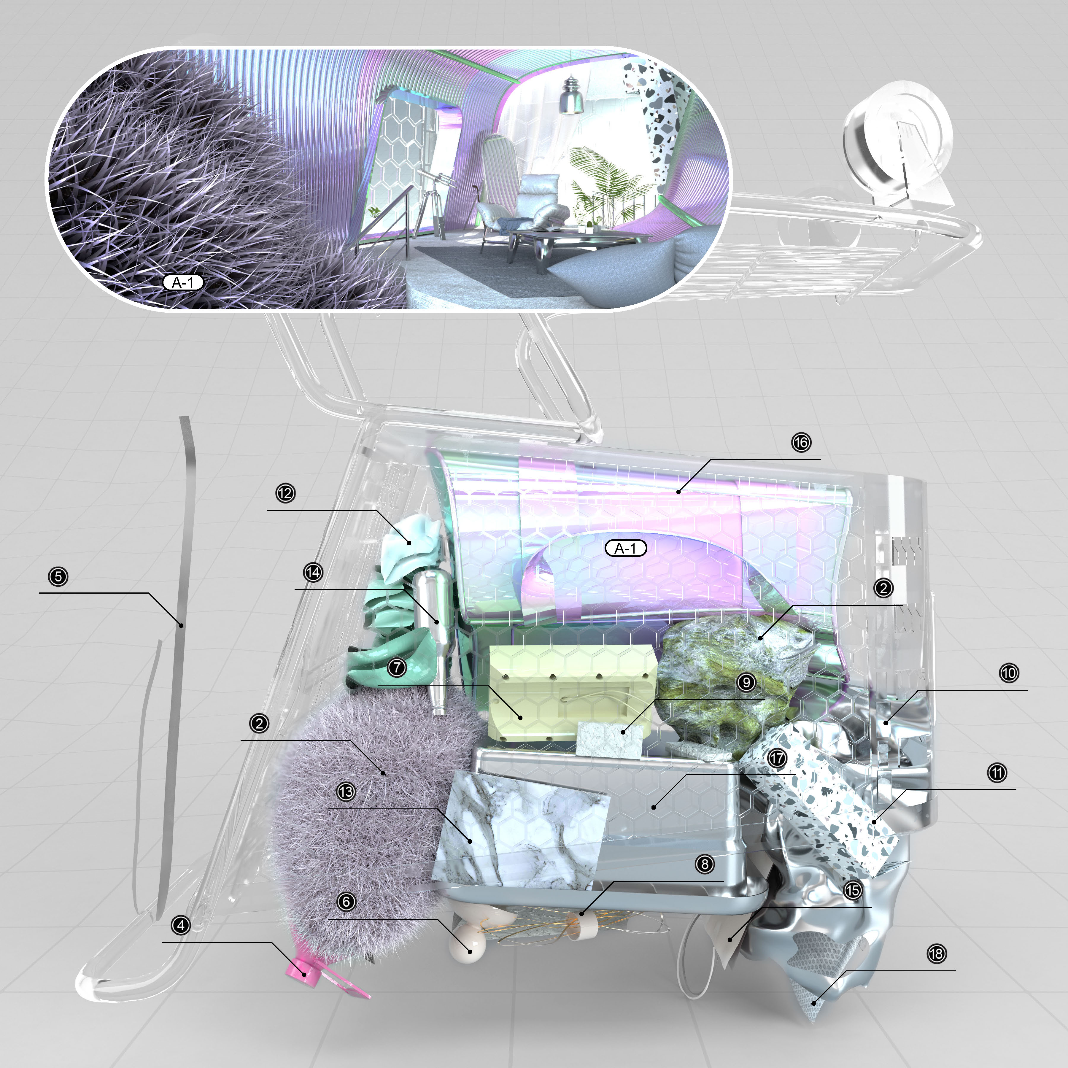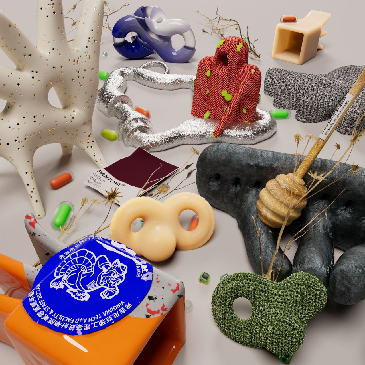 All objects at the scene are collected from John Hejduk's work "Victims." Those "little monsters" have been simulated and puffed up to transition away from their original geometrical, strict, and hardcore forms...