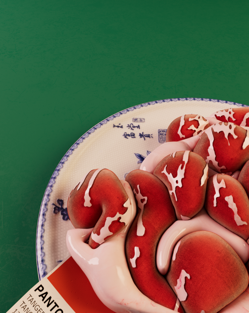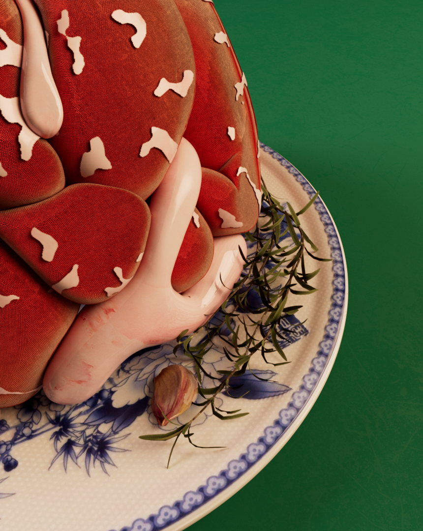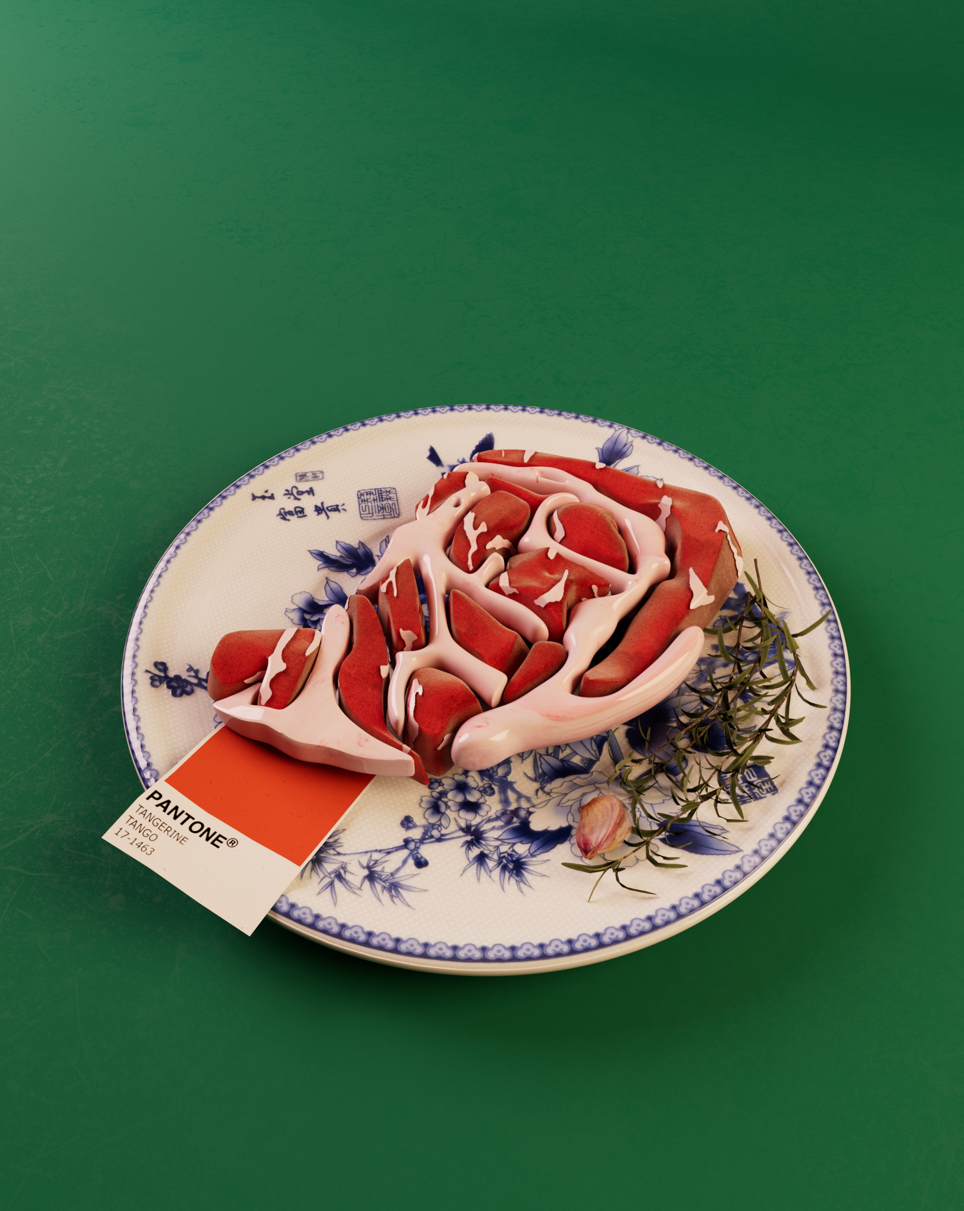 It is a piece of steak. It has been taken apart following a digital template and then put back together. It is serviced on a Chinese porcelain plate with one clove of fried garlic and fresh rosemary. Oh, there is also a Pantone color card for color reference. It is textured with marble and cloth. It grows like a plant. It is a piece of steak.