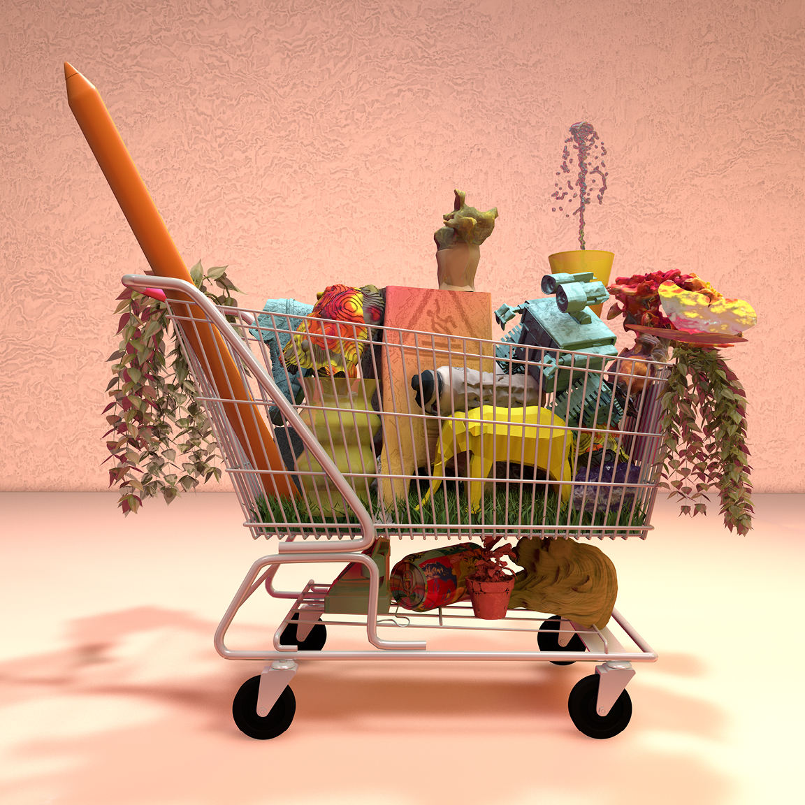 Students collaborate in teams of two or three, sharing resources and archived objects to form a collective collection. Using curatorial strategies, each object is relocated and redefined within a digitally modeled shopping cart, framing the process as an upcycling of digital waste. The presentation emphasizes the still life qualities of the overflowing cart through digital renderings and vector drawings. Each object is developed using the concept of phygital materials, understood as emerging from the exchange between physical material behavior and digital material simulation.